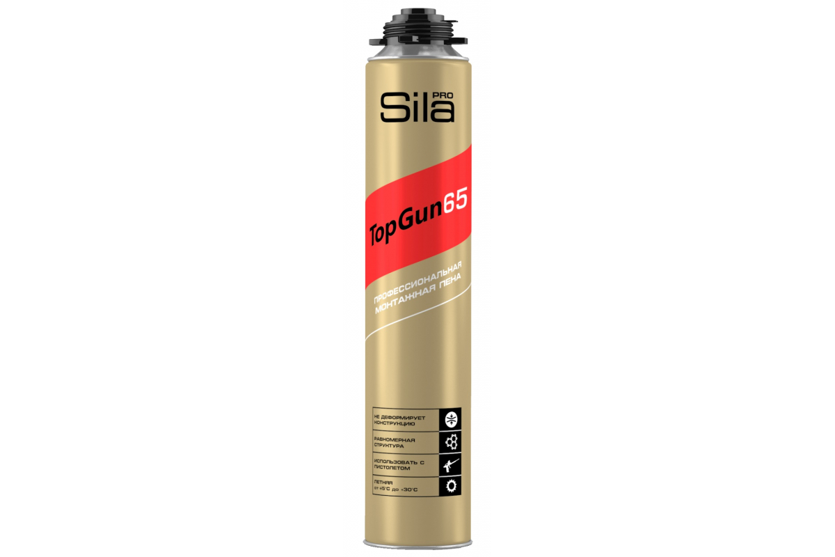 Профессиональная монтажная пена Sila летняя Pro TopGun 65 875мл SPTG65P875S предназначена для установки технических коммуникаций, оконных и дверных проемов, подоконников, тепло- и звукоизоляции помещений, крепления стеновых панелей, заполнения швов и пустот, герметизации отверстий и щелей.
